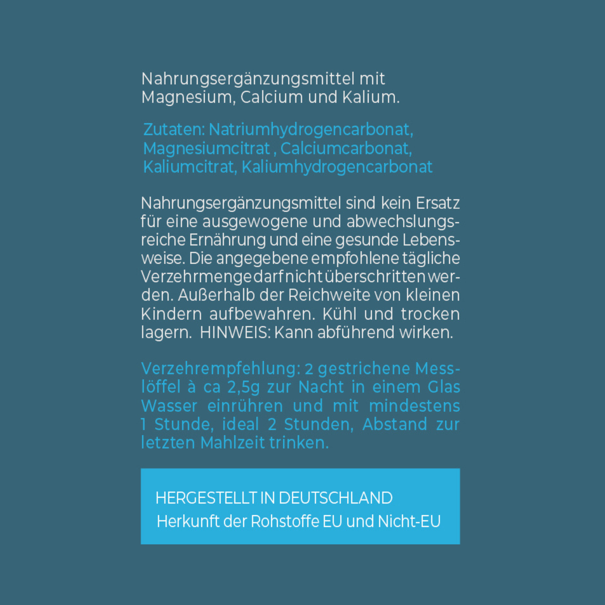 Das in mir enthaltene Calcium unterstützt deine Muskeln und den Energiestoffwechsel. Das Kalium hält deinen Blutdruck im normalen Bereich und das Magnesium stärkt deine Knochen und Zähne. Außerdem sorgen meine 3 Freunde, Calcium, Kalium und Magnesium, für ein normales Elektrolytgleichgewicht, mehr Energie und Sie schützen deine Zellen vor oxidativem Stress. Müdigkeit wird ebenfalls verringert.