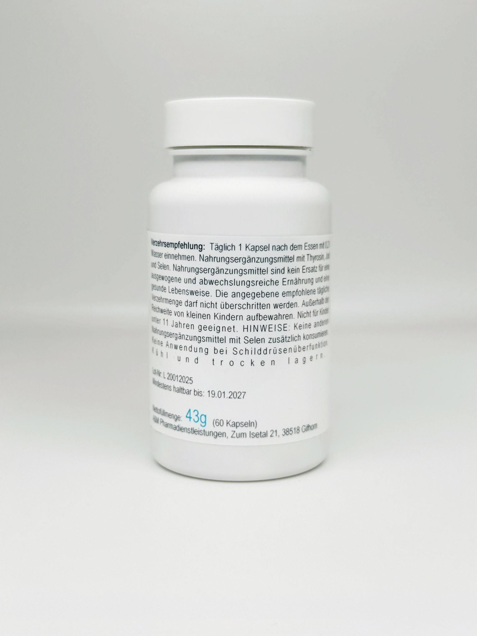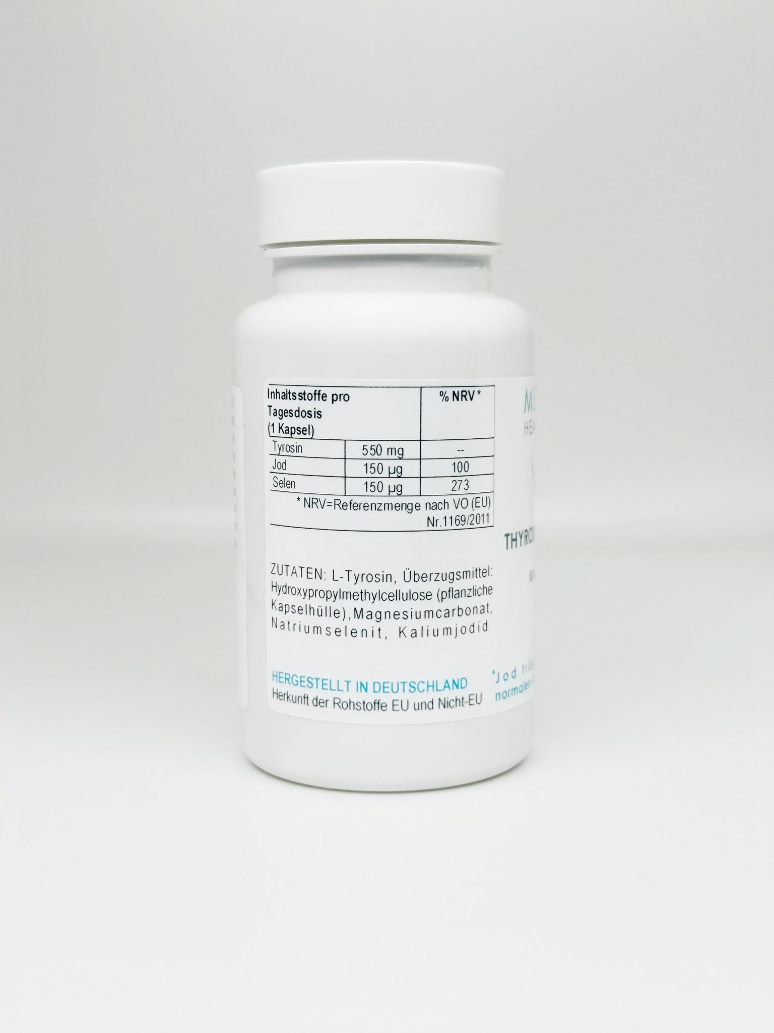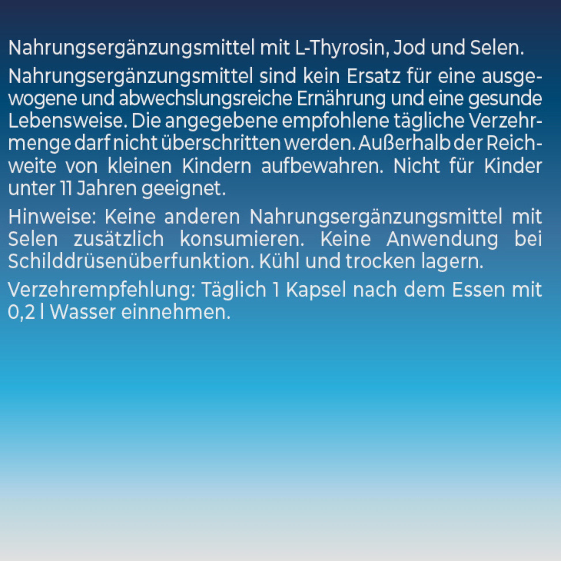 In mir steckt Selen, Jod und ein freies, hoch bioverfügbares L-Tyrosin. Ich trage zur normalen Produktion und Funktion von Schilddrüsenhormonen bei und helfe dir deine Verdauung zu regulieren und die Gesundheit deiner Haut zu erhalten.